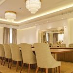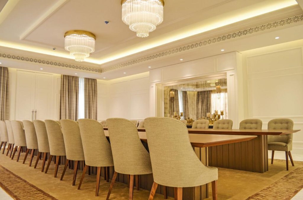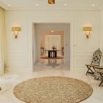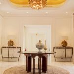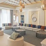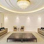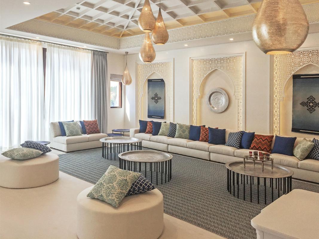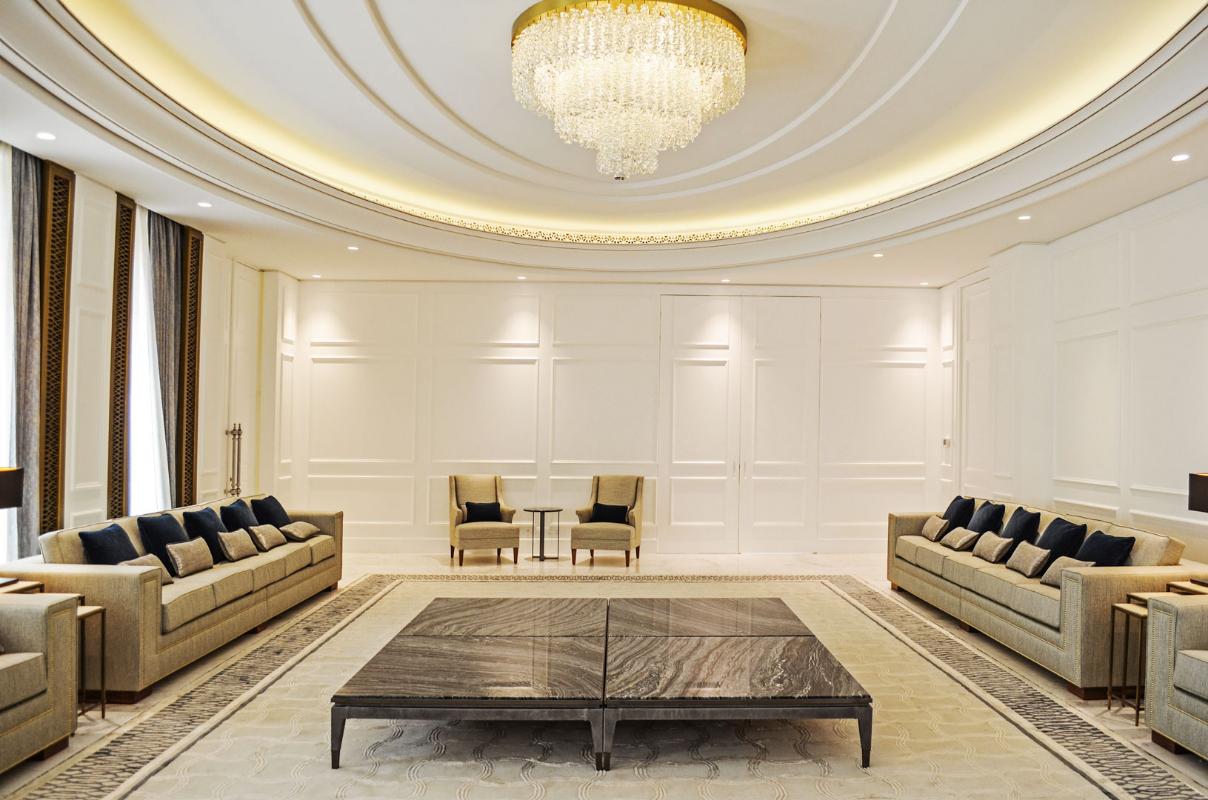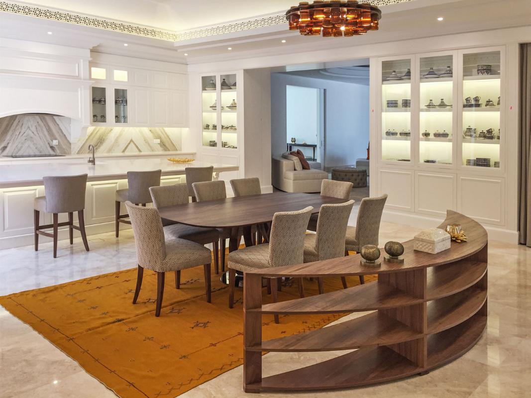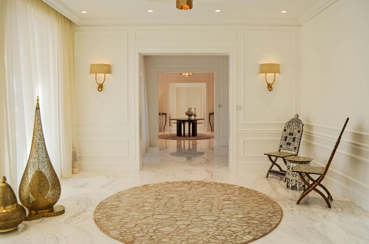 The design language subtly embeds Moroccan traditions through intricate mashrabiya motifs and backlit arched alcoves, reimagining the traditional majlis for an urban, global context. Curated accessories, including hammered brass lanterns and sculptural ceramics, provide a refined narrative of luxury. Lighting serves as a transformative tool, ranging from the celestial glow of tiered crystal chandeliers to the warm luminosity of recessed golden coves. This villa is an adaptable sanctuary, celebrating regional identity through a lens of modern refinement and effortless sophistication.